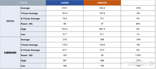 在《古墓丽影暗影》《DOTA2》中,7800X3D平均帧和1%low平均帧领先,不过0.1%low平均帧被14600KF实现领先。