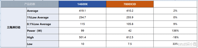 在《三角洲行动》中,14600KF在平均帧和0.1%low平均帧处于领先,1%low平均帧也能与7800X3D持平。