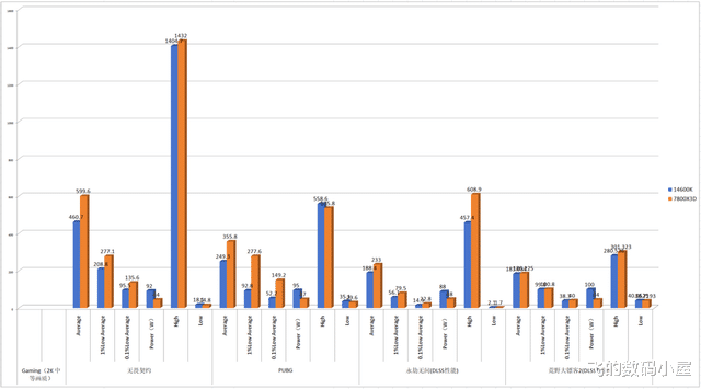 从测试成绩来看,不同游戏中两者各有胜负。在2K中等画质下的《无畏契约》《PUBG》《永劫无间》《荒野大镖客2》中,7800X3D的三项平均帧均处于领先。