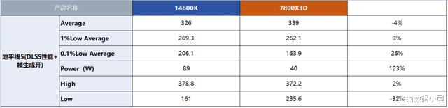 在《极限竞速地平线5》《F124》中,7800X3D平均帧领先,可1%low平均帧和0.1%low平均帧却被14600KF反超。